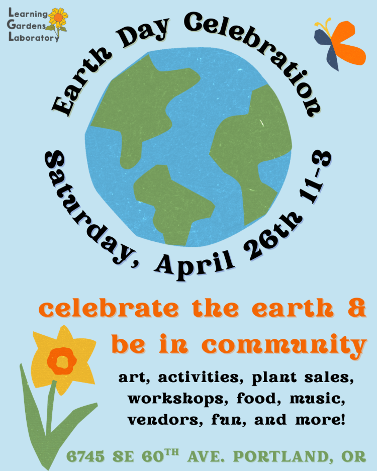 Events Posted byLearning Gardens LabMarch 11, 2025April 8, 2025Posted inUncategorized Upcoming Happenings at LGL Earth Day Celebration Saturday, April 26th, 11am to 3pm at LGL More details coming soon! Share this: Share on X (Opens in new window) X Share on Facebook (Opens in new window) Facebook Like Loading... Related